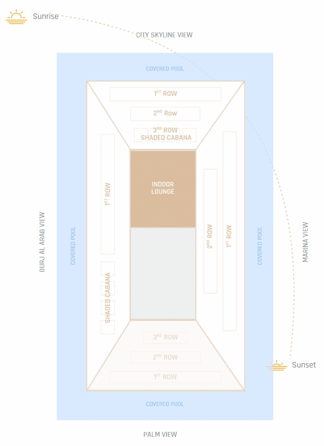 Afternoon Pool | 15:00 – 19:00 | ה-Vibe של השקיעה. הסשן הפופולרי ביותר והכי יקר. | 300 AED |