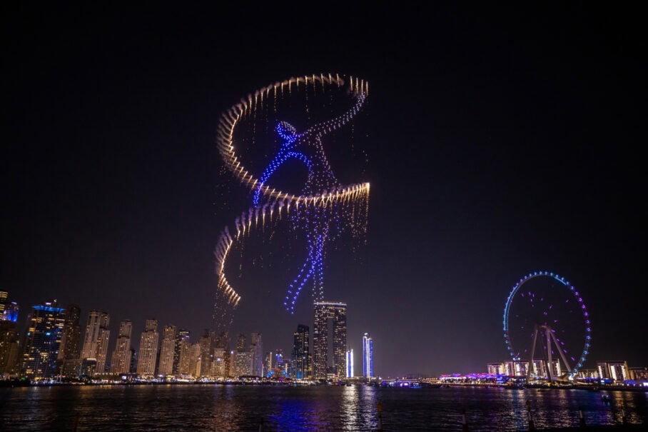 אחרי שנים שבהן דובאי כיכבה עם תצוגות אור מרהיבות, השנה היא לוקחת את זה צעד קדימה: המהדורה הנוכחית משלבת לראשונה אפקטים פירוטכניים המונעים על ידי רחפנים (Drone-powered Pyro Effects).
